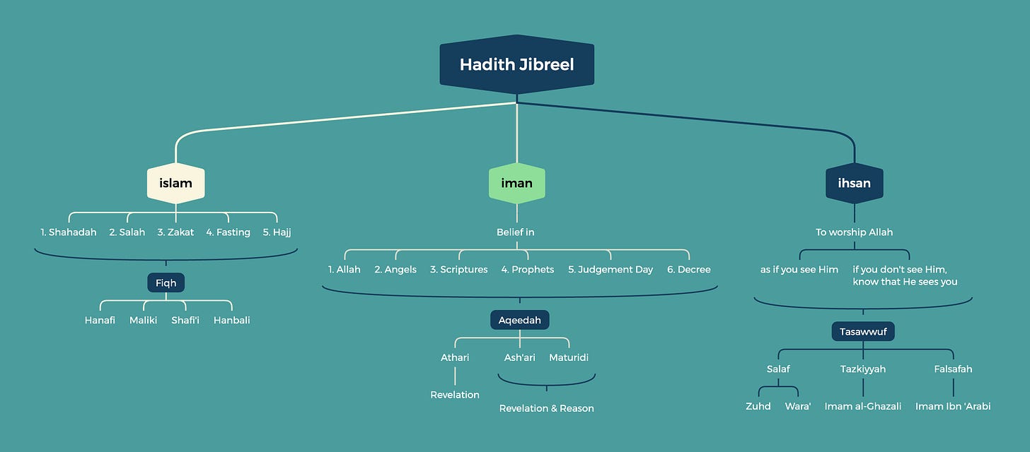 The Islamic tradition recognises three fundamental dimensions of religious life: Islam, Iman, and Ihsan. This framework, derived from Hadith Jibreel (known as Umm al-Sunnah), provides the organisational structure for understanding our religion.